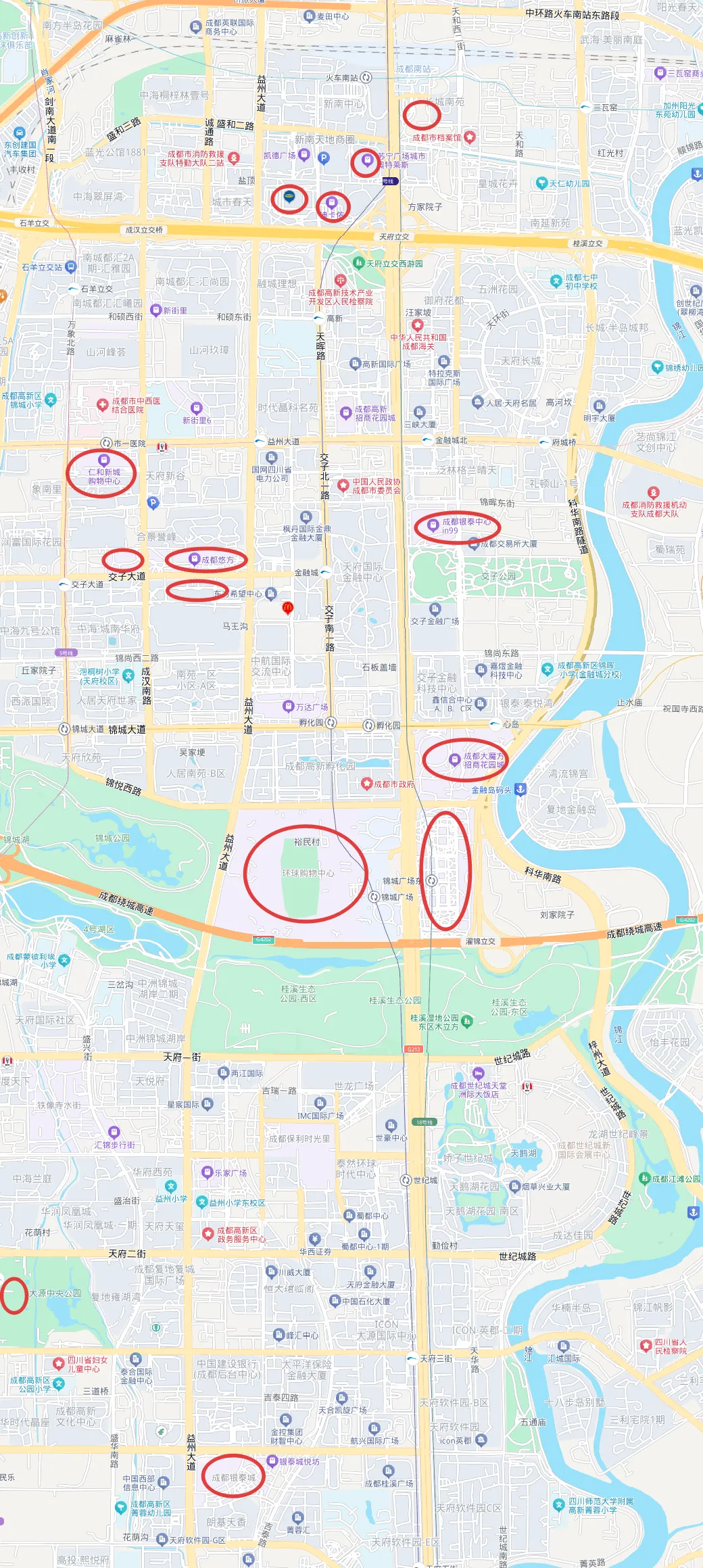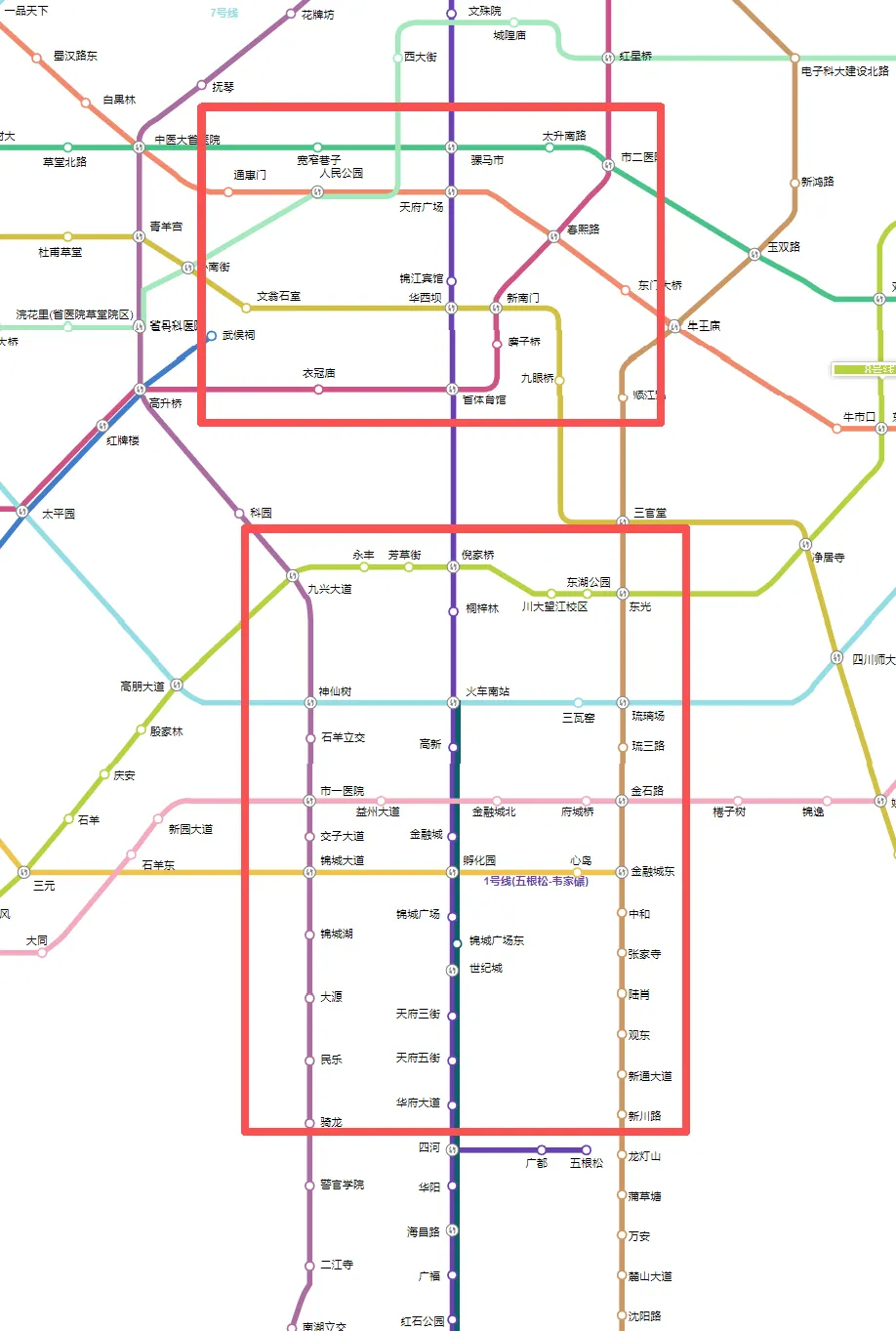 在新区的商业纵轴覆盖的商业区至少有3个两线换乘站,分别为火车南站、孵化园、世纪城,其中火车南站、孵化园更是三线换乘站,而核心商圈交子公园就在这三站的覆盖范围。