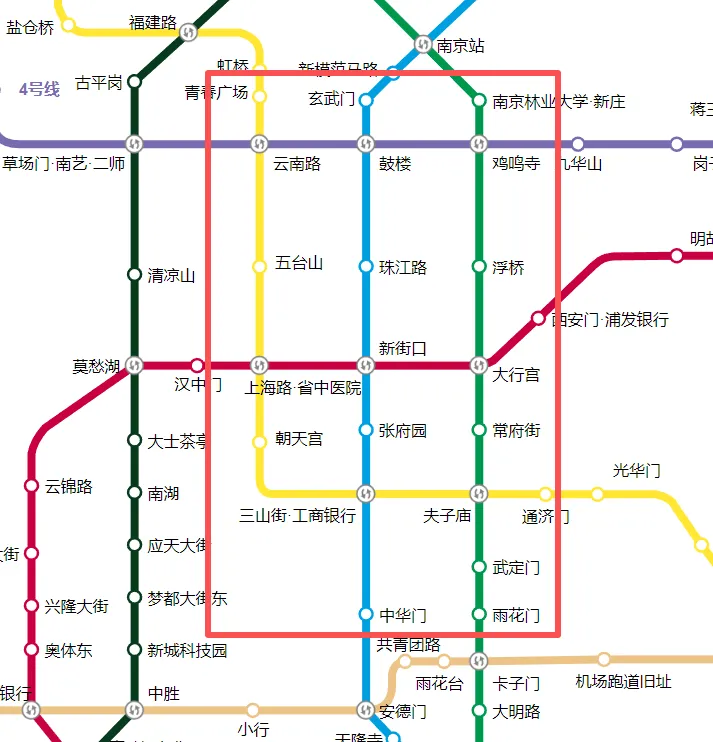 此外,这条线1公里左右间隔的纵向平行线还有2条,即3号线和5号线,它们继续产生新的两线换乘站,比如大行宫、鸡鸣寺、云南路、上海路、夫子庙。