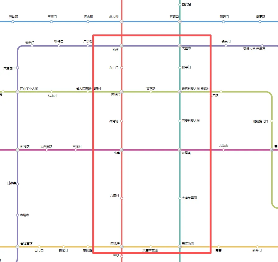 此外,这条线1.5公里左右间隔的纵向平行线还有1条,即4号线,它继续产生新的两线换乘站,比如五路口、大差市、建筑科技大学、大雁塔、曲江池西。