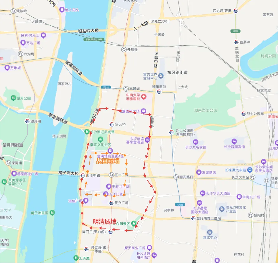 但我们回顾长沙建城历史会发现,无论是两千年多前的战国城墙,还是两百年多前的明清城墙,它的中轴就是位于今天的黄兴路。