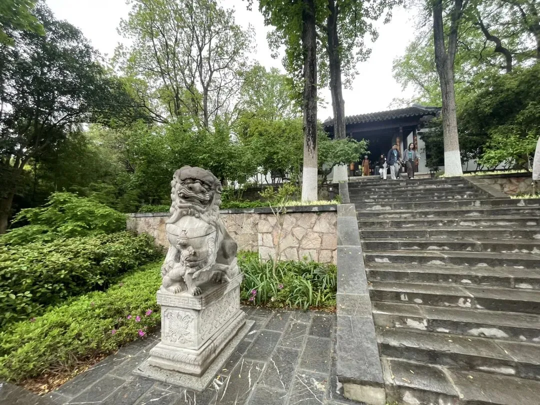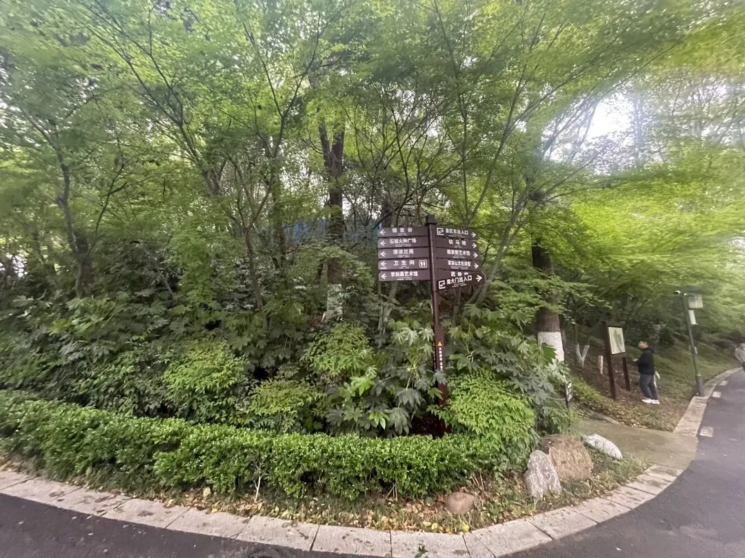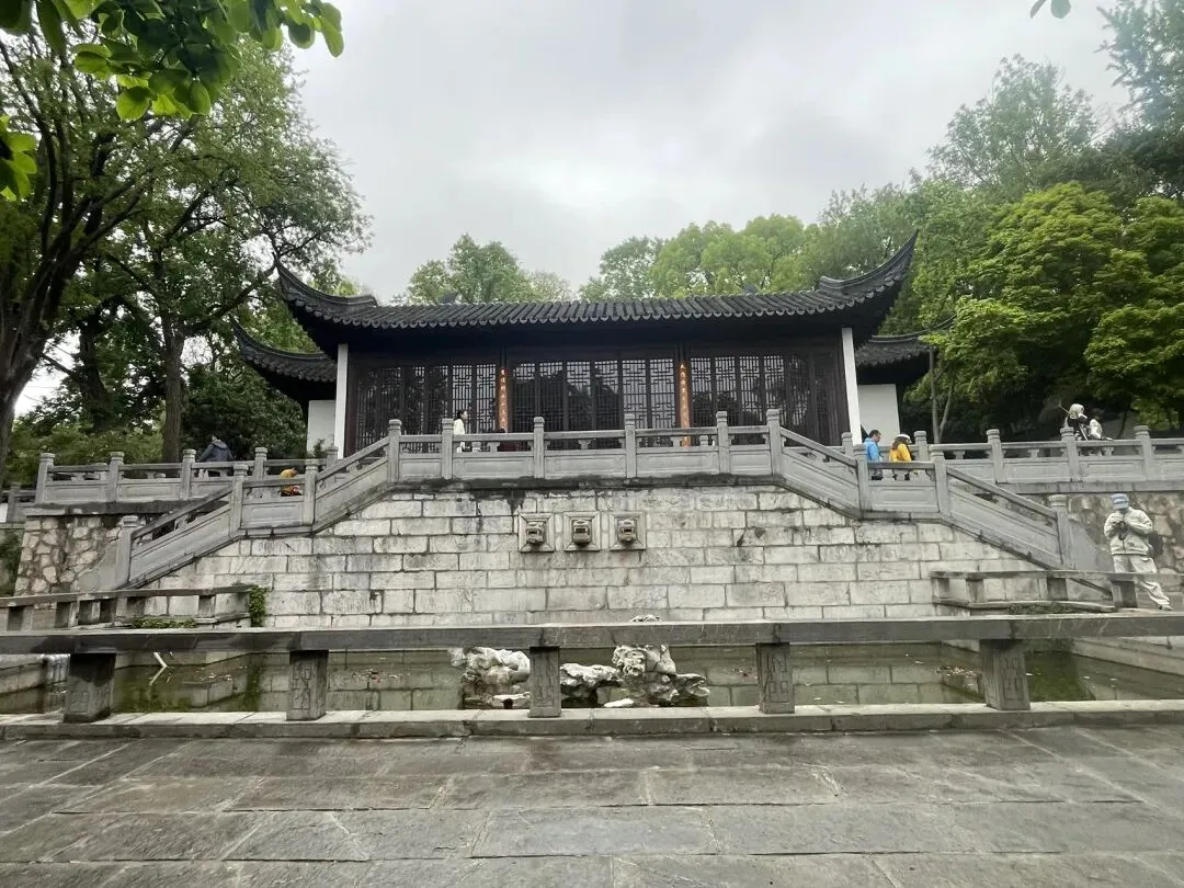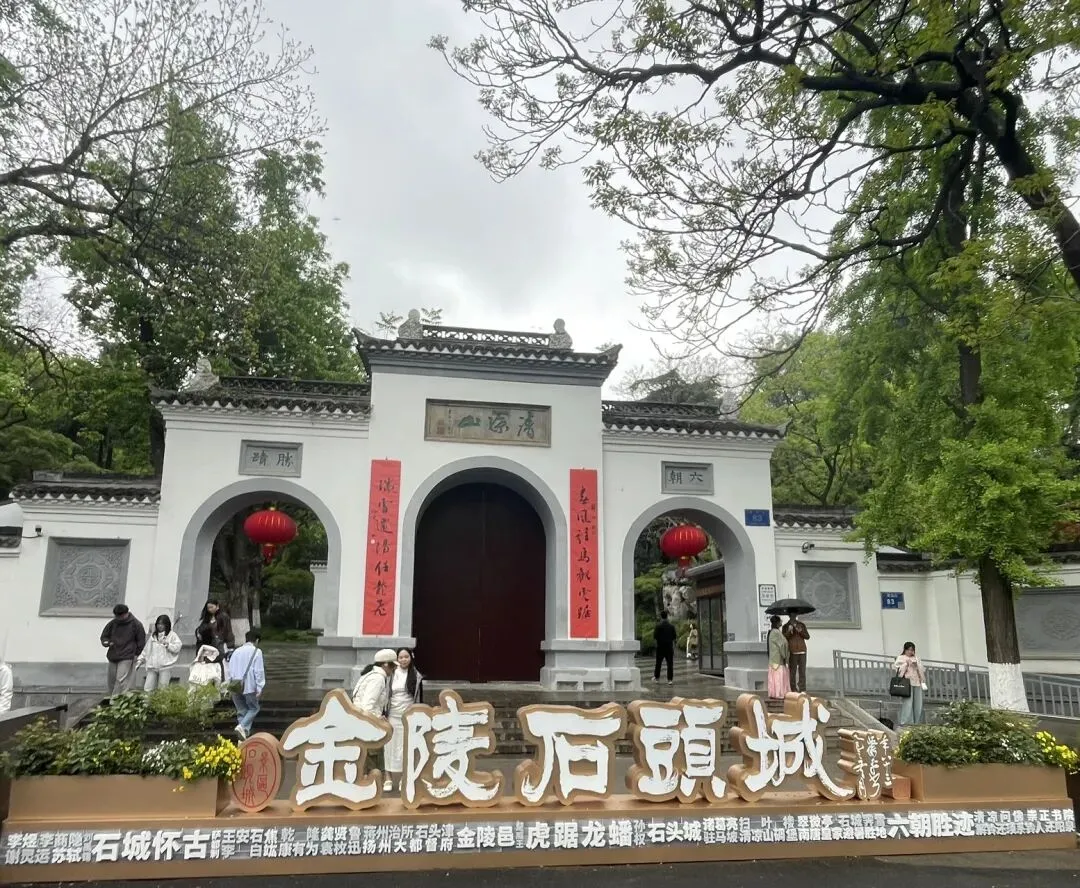 飞檐翘角歇山顶、白墙黛瓦、木质花格门窗,坐落在石砌高台之上,气势庄重。高台下方是放生池(砚池),池壁嵌有三个兽首吐水口,池内点缀太湖石出门左手边为银杏谷方向,还可以一直步行直达石头城/国防园景区;右手边为驻马坡方向。可以根据个人需要继续参观游览。