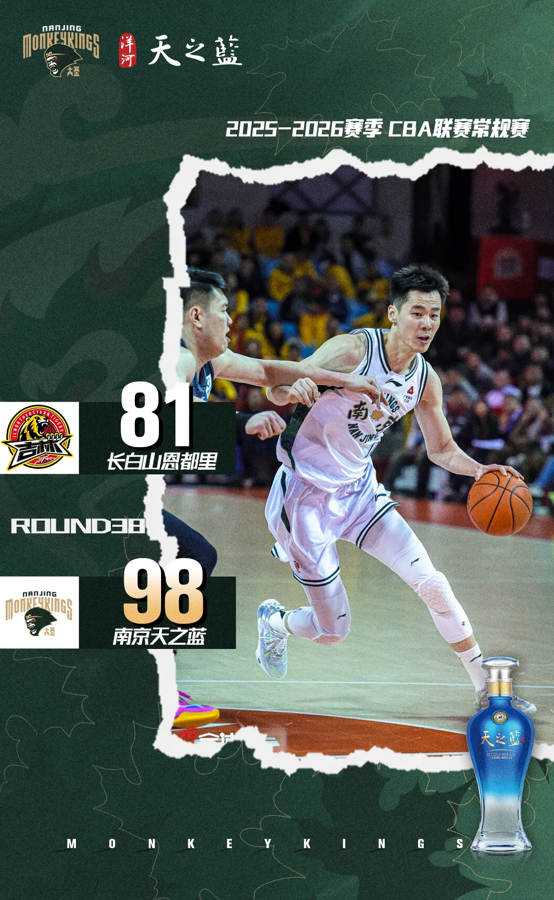 末节决战,赵柏清篮下接应放篮,随后接郭昊文助攻顺下单臂扣篮。帕克反击一骑绝尘上空篮再中,吉林队暂停调整。郭昊文侧翼三分延续手感,栾利程空切上篮,赵柏清中距离跳投稳稳命中。段立谦两罚中一,马内克三分手感不减,随后接赵柏清高位假投真传轻取两分。段立谦远投三分,栾利程空切上篮,段立谦再下两罚。祝铭震空切上篮,栾利程连得5分,球队换上年轻球员。全场比赛结束,长白山恩都里81-98南京天之蓝。