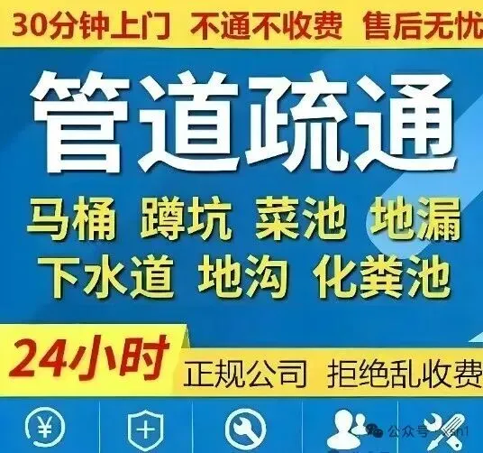 🔧服务内容 ✅ 管道疏通:厨房油污管、卫生间排污管、阳台排水管、老楼铸铁主管道 ✅ 下水道疏通:小区主副管道、市政管网、化粪池清理、雨水井 ✅ 马桶疏通:蹲坑堵塞、坐便器异物、尿碱硬化、冲水无力 ✅ 地漏疏通:毛发缠绕、锈死地漏、异味反味、洗衣机排水慢 ✅ 其他:洗菜盆、浴缸、面盆、排污泵、隔油池清洗