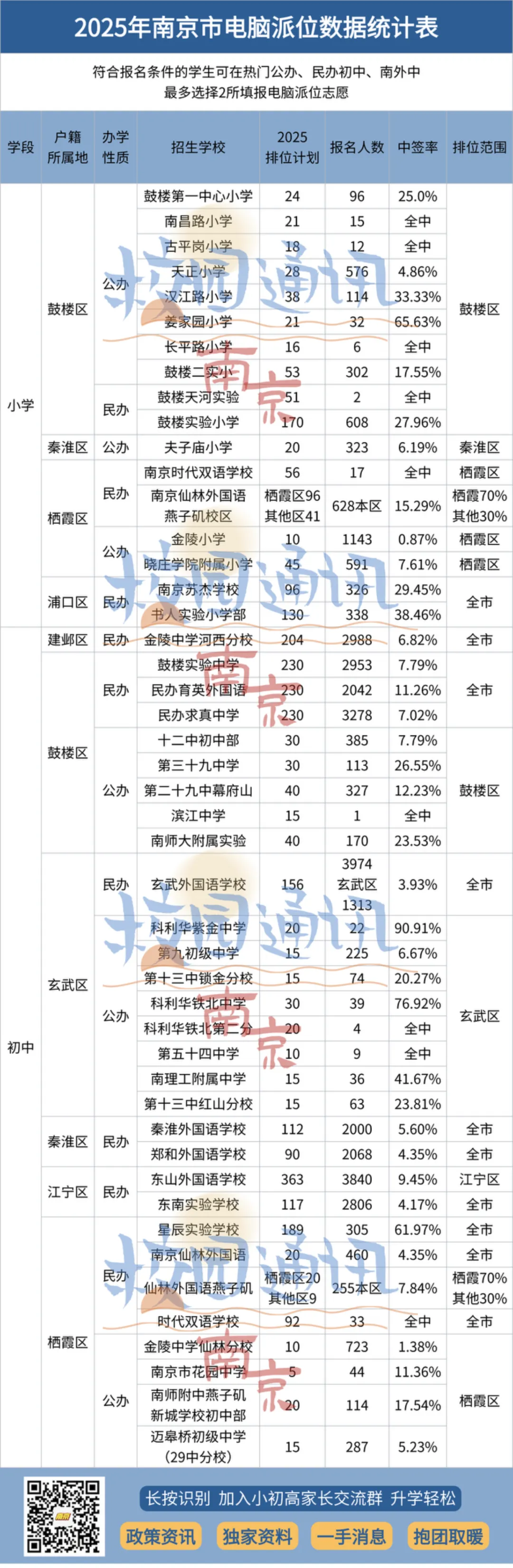在摇号名额普遍扩招的情况下,热门校摇号中签率基本上维持在个位数,玄外3.93%、金陵河西6.82%、求真7.02%、鼓实7.79%、秦外5.6%......