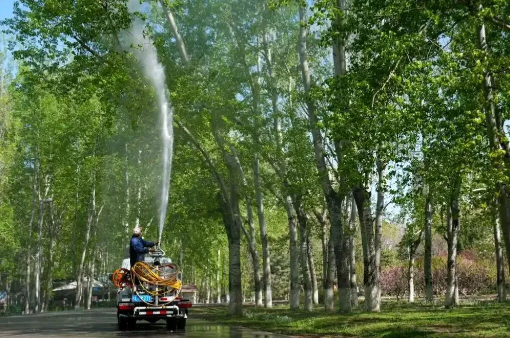 4月11日上午,北京奥林匹克森林公园北园,园林工人将一种特殊药剂注入清洗车水箱,开启高压水枪对杨树雌株进行喷洒作业。洒水车里加入的,正是今年首次大面积推广的飞絮凝絮剂。