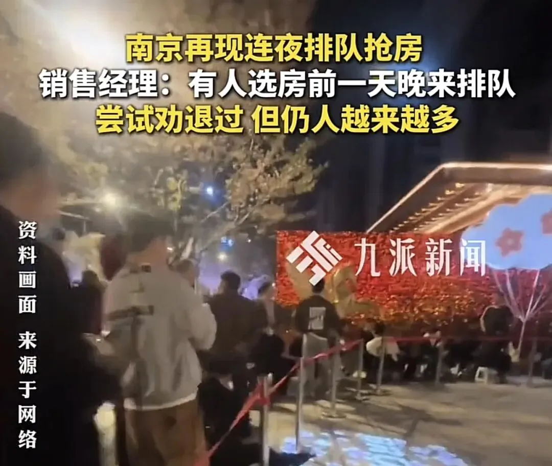 一则报道的是南京出现了连夜排队买房,开发商表示为了分散人流,特意选择了下午开盘,没想到头一天半夜三四点就有市民踊跃排队了,并且当天99套房仅剩了几套沿街的没有售出,其他全部售完。