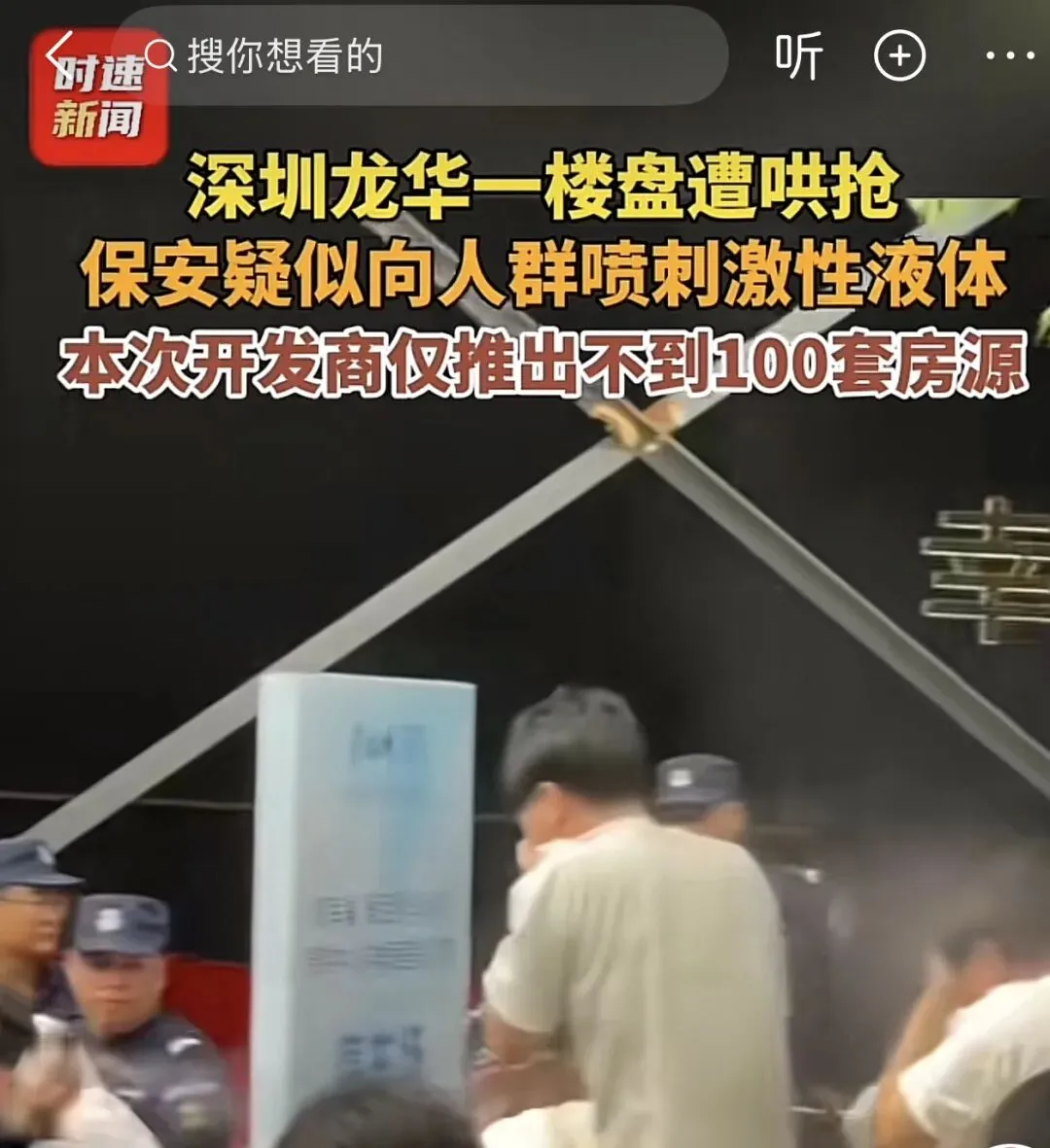 另一则报道是深圳龙华一小区开盘,瞬间找到了哄抢,以至于保安现场喷洒不明液体来驱赶抢购者,据统计100套房源全都卖光。