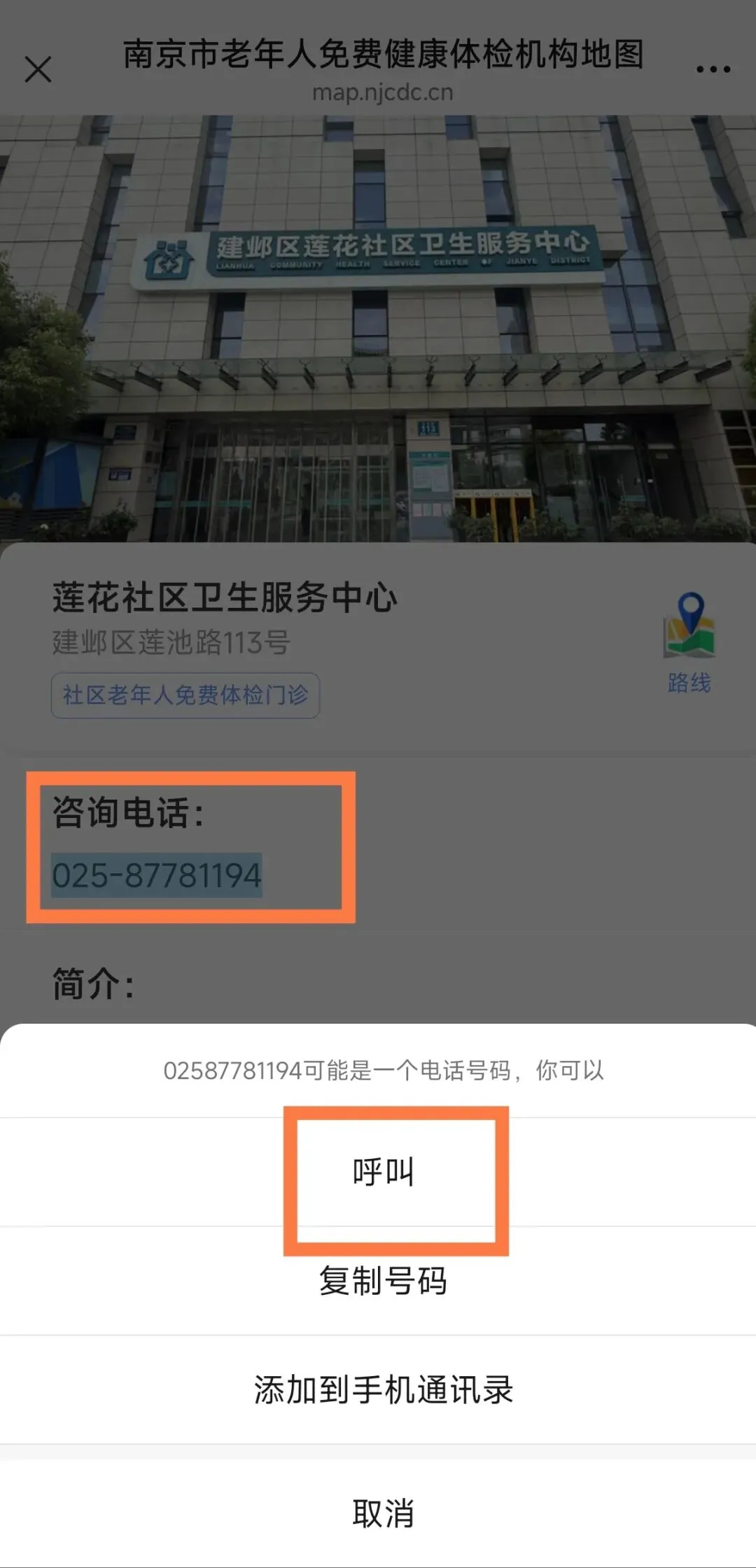 页面显示该体检机构的咨询电话,点击电话号码,即可一键拨打,方便您提前咨询预约事项,确认细节或询问路线。