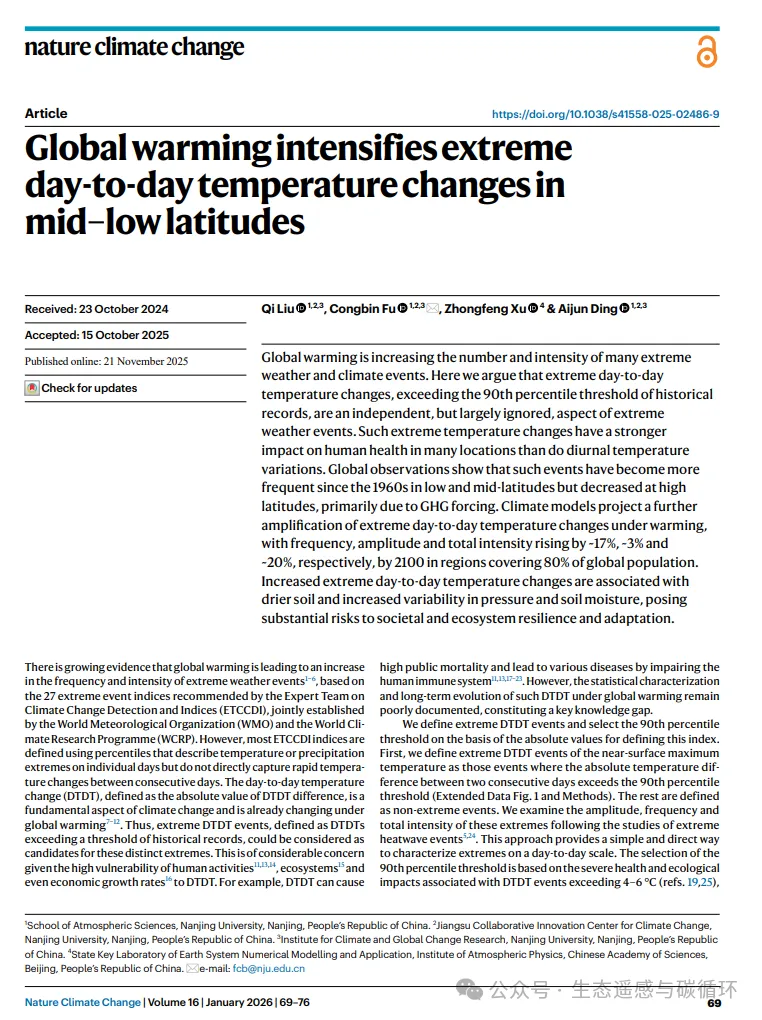 文章标题:Global warming intensifies extreme day-to-day temperature changes in mid–low latitudes