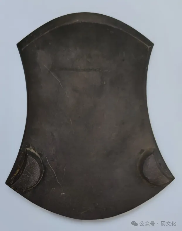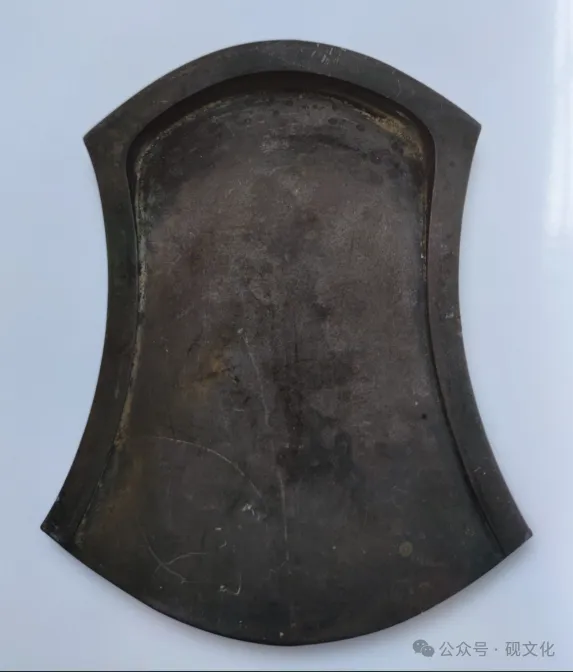 砚呈风字形,青紫色。砚堂开阔,微向前倾斜至砚首,交接处凿砚池,砚堂下端有一石眼。砚背前端以圆弧线着地,后端附月形双足。据墓志得知,墓主人是南宋文人张同之夫妇。