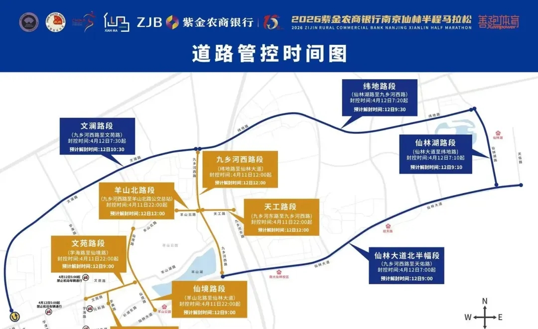 - 4月12日7点开始,仙林大道北半幅(九乡河西路到天佑路)东向西禁行;7点10分,仙林湖路双向禁行;7点20分,纬地路双向禁行……直到比赛结束。
