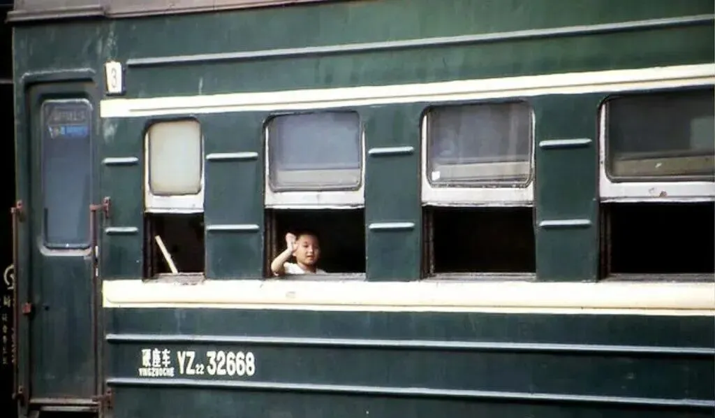 第一张照片里,一个小孩从绿皮车的窗户里探出头来,还抬手打了个招呼。说实话,这个细节一下就把整张图弄活了。那种老式火车窗是可以上下推开的,下面留出一截,风就直接灌进来。现在看会觉得简陋,可那时候坐这种车,很多人最先记住的,就是窗外能看见站台,站台也能看见你。