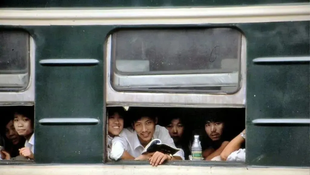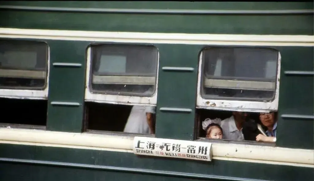 第二张更热闹。几个年轻人挤在窗口边上,白衬衫、短头发,脸都贴得很近,有人笑着看镜头,有人神情有点疲惫,还有人手边放着一瓶饮料。这样的画面,现在高铁上几乎见不到了。车窗是封闭的,人和站台隔得很远;可那时候不是,车一停,窗里窗外几乎就连在一起。站台上的人找车厢,车厢里的人看送行的人,顺手还能递个袋子、说两句话,甚至塞个苹果进去。火车还没开,离别就已经开始了。