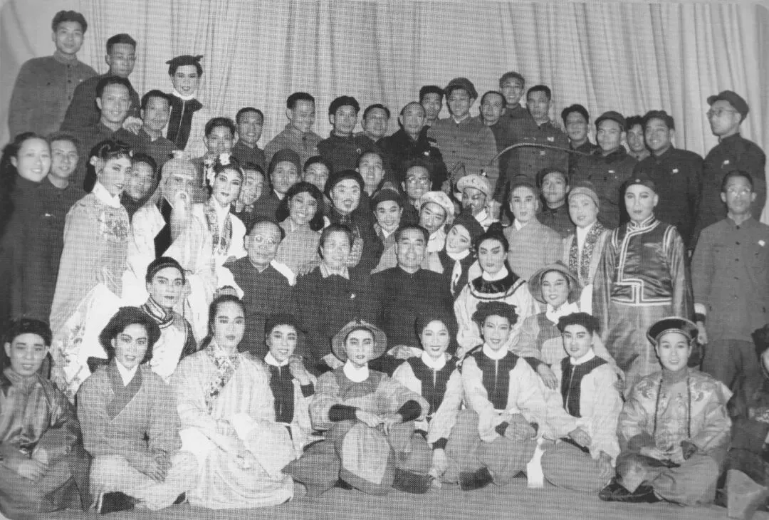1956年3 月 4 日,剧团由中国科学院包场在政协礼堂继续演出《南冠草》。时任中科院院长的郭老特地请来周恩来、邓颖超夫妇前来观看。演出结束后,郭老陪同周总理、邓颖超到后台看望演职员人员并与他们合影留念,给予剧团演出以很高的评价。“三八” 妇女节这天,剧团还在政协礼堂演出了《柳毅传书》招待驻外使节及家属。当时周总理、邓颖超、陈毅、张茜、郭沫若、于立群也前来观看。演出那天场内气氛十分热烈。面对演出盛况,南京市文化局委派艺术科科长晨钟专程赴京看望剧团全体人员,并宣布剧团拟批准为国营剧团(原为民营)。全团人员闻此喜讯兴奋不已。不久,郭老又陪同著名剧作家老舍来到剧团驻地共商《南冠草》某些唱词的修改。这天,团长竺水招还特请郭老为剧团题名,郭老慨然应承。