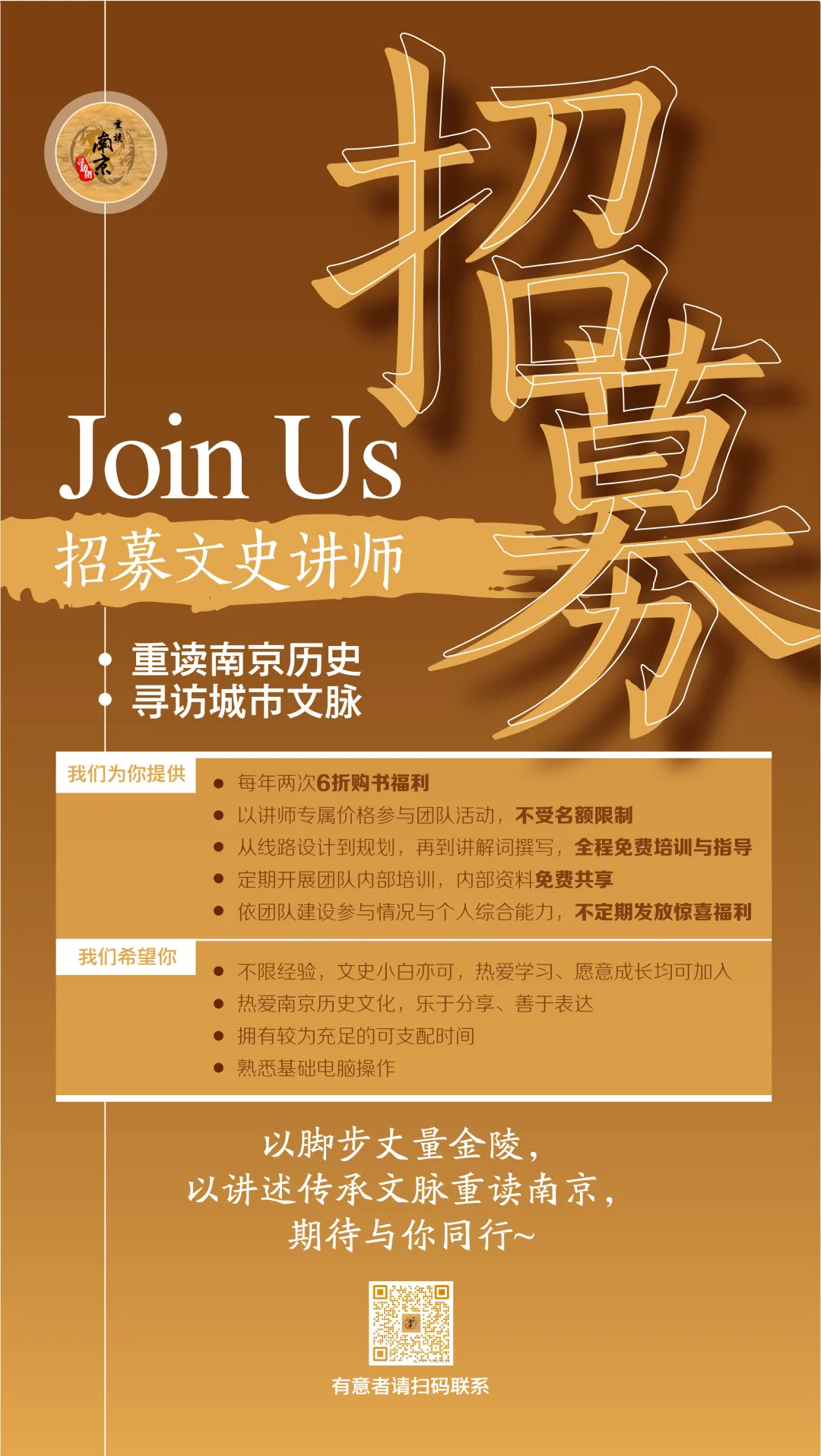 以脚步丈量金陵,以讲述传承文脉,期待和你一起重读南京!有意者扫码联系我们,开启你的文史讲师之旅~