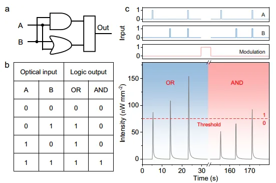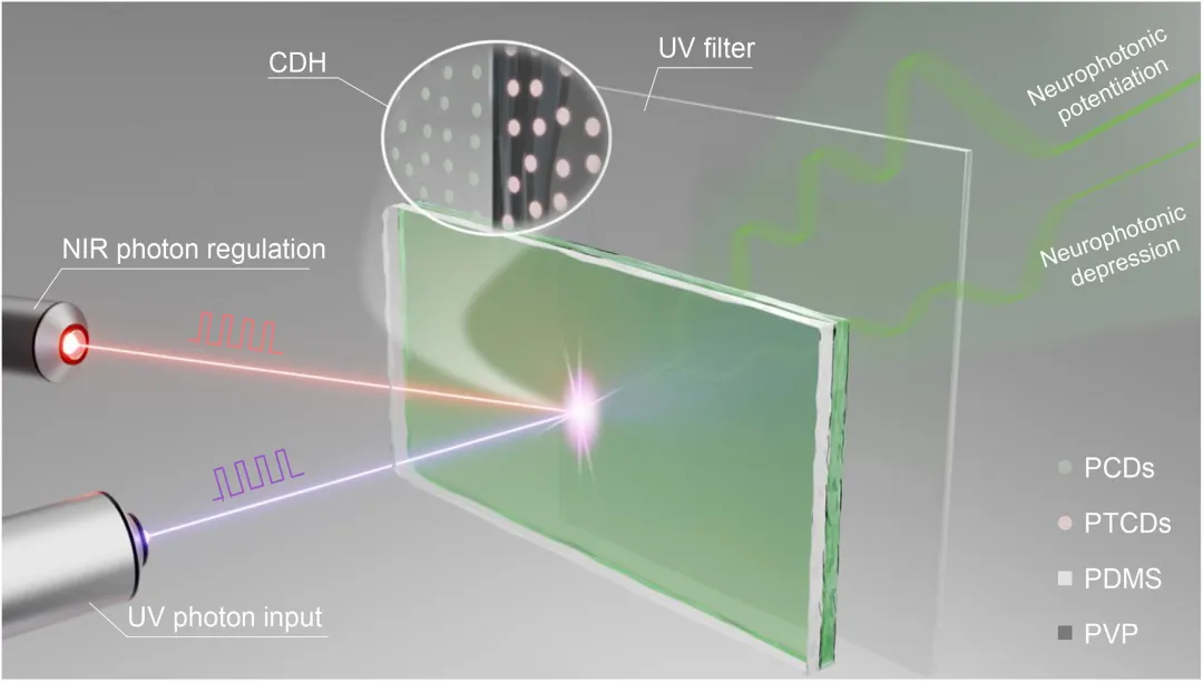 研究人员报道了一种基于磷光与光热碳点杂化(CDH)的全光突触体系,通过双光子介导策略首次实现紫外增强与红外抑制的双向突触可塑性调控。该结构利用激子缓释与磷光叠加机制,将光脉冲直接转换为神经形态信号,无需外加电场即可完成“或”与“和”逻辑门的全光动态切换。基于此构建的神经视觉系统可实时追踪运动光点,对轨迹、速度、方向等参数识别精度达97%。