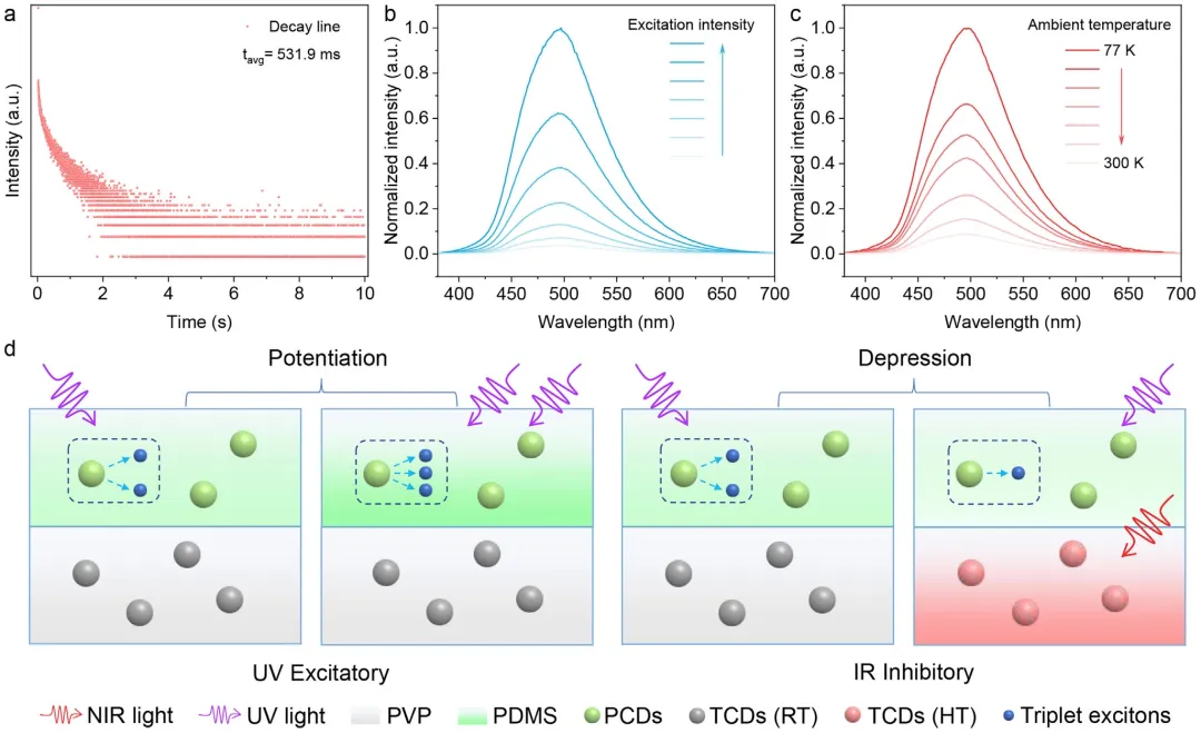 大家好,今天为大家分享来自南京工业大学周哲教授、刘举庆教授、黄维院士团队近期在 Small 上发表的研究论文将光信号的感知与处理融为一体的全光突触 (AOS) 代表了光计算与神经形态成像领域的前沿变革方向。现有全光突触大多仅限于单向权重调制,通过全光通路同时实现兴奋性与抑制性输出仍是一项挑战。本文报道了一种双光子介导策略,可在磷光与光热碳点杂化 (CDH) 神经递质中实现双向神经可塑性。该调控过程通过紫外与红外光操控实现激子的可控释放及磷光发射的叠加,从而达成神经光子增强与抑制输出。基于上述特性,CDH能够实现光学逻辑运算以及具备实时追踪识别光物体运动轨迹、速度与方向能力的神经视觉,且识别精度高达97%。本工作为全光计算与成像领域磷光范式创新提供了一种全光调控方法。关键词: 全光、双向突触可塑性、碳点、运动检测、光学神经网络
