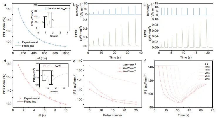 图1:双向全光神经形态系统。碳点杂化 (CDH) 神经递质中测试方法及双向神经光子过程的描述。图2:CDH表征与光学性质。(a) PCDs的磷光衰减曲线与寿命,记录于468 nm发射波长、340 nm激发波长下。不同 (b) 强度与 (c) 温度条件下340 nm激发时的磷光光谱。(d) CDH中磷光的双向可塑性 (紫外激发增强,近红外抑制)。图3:双光子介导的神经光子行为。(a) PPF指数随脉冲间隔变化的函数关系图(PPF:双脉冲易化,Wpulse:脉冲宽度)。插图为固定265 nm波长下两个连续脉冲引发的兴奋性突触后电流 (EPSI)。(b) PPF模式下的SIDP与 (c) STDP。(d) PPD指数随脉冲间隔变化的函数关系图 (PPD:双脉冲抑制)。插图为固定800 nm波长下两个连续脉冲引发的抑制性突触后电流 (IPSI)。(e) PPD模式下的SIDP与(f) STDP。图4:光子数字逻辑运算。(a) 通过协调光输入动态切换“或”与“与”逻辑门的工作机制示意图。突触可塑性由365 nm (输入A) 与265 nm (输入B) 突触前刺激的干涉调控,近红外光作为调制输入实现“或”门向“与”门的转换。(b) “或”与“与”逻辑功能的真值表。(c) 全光控制下“或”与“与”门操作的仿真结果。图5:面向运动识别的神经形态成像。(a) 突触在7个连续增强脉冲 (265 nm,8.85 µW mm⁻²,3.3 Hz,脉宽Wpulse = 0.1 s) 与10个连续抑制脉冲 (800 nm,9 mW mm⁻²,0.1 Hz,脉宽Wpulse = 6 s) 触发下的长时程增强 (LTP) 与长时程抑制 (LTD) 特性。(b) 神经网络的准确率计算。(c) 用于运动识别的类脑神经网络示意图。第10次训练周期后针对运动参数 (d) 方向、(e) 旋转、(f) 速度、(g) 加速度的权重映射图,以及对应的聚类结果 (h–k)。(l) 运动参数识别准确率随训练周期的变化。