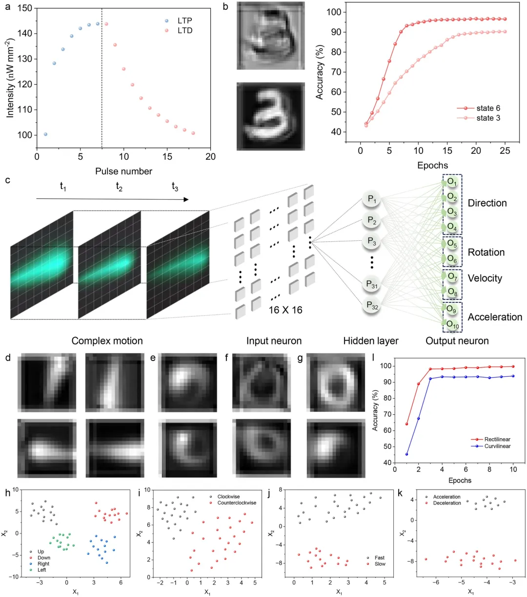 我们成功开发了一种磷光与光热碳点杂化材料,通过双光子介导策略,使其成为多功能的类神经平台。基于激子的缓慢释放与磷光发射叠加效应,借助紫外与红外光的选择性加载,可精确且可逆地调控增强与抑制两种双向神经可塑性,从而将光脉冲直接转化为神经形态信号。通过光学逻辑运算的实现,以及更具标志性意义的神经视觉的构建,全光调控能力得到了有力验证。该系统展现了前所未有的性能——能够对光物体进行实时追踪与识别,并精确解析包括轨迹、速度与方向在内的复杂运动参数,识别准确率高达97%。这一基于CDH的方法为直接在光子域运行的高效、无噪声全光神经形态计算机及智能视觉系统的发展开辟了道路。