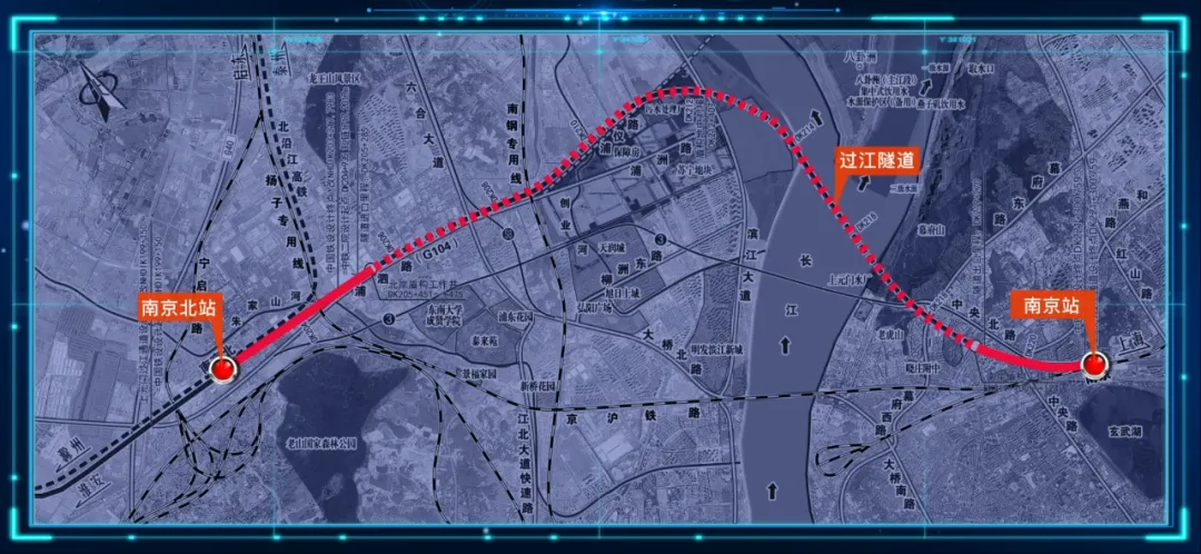 它北起南京北站,南接南京站,正线全长约20.4公里,采用单洞双线高速铁路隧道设计,是南京第一条高速铁路过江隧道。建成后,宁淮城际、沪渝蓉高铁等线路的列车,可以直接从江北钻过江底,开进南京站,并通过既有联络线接入南京南站。