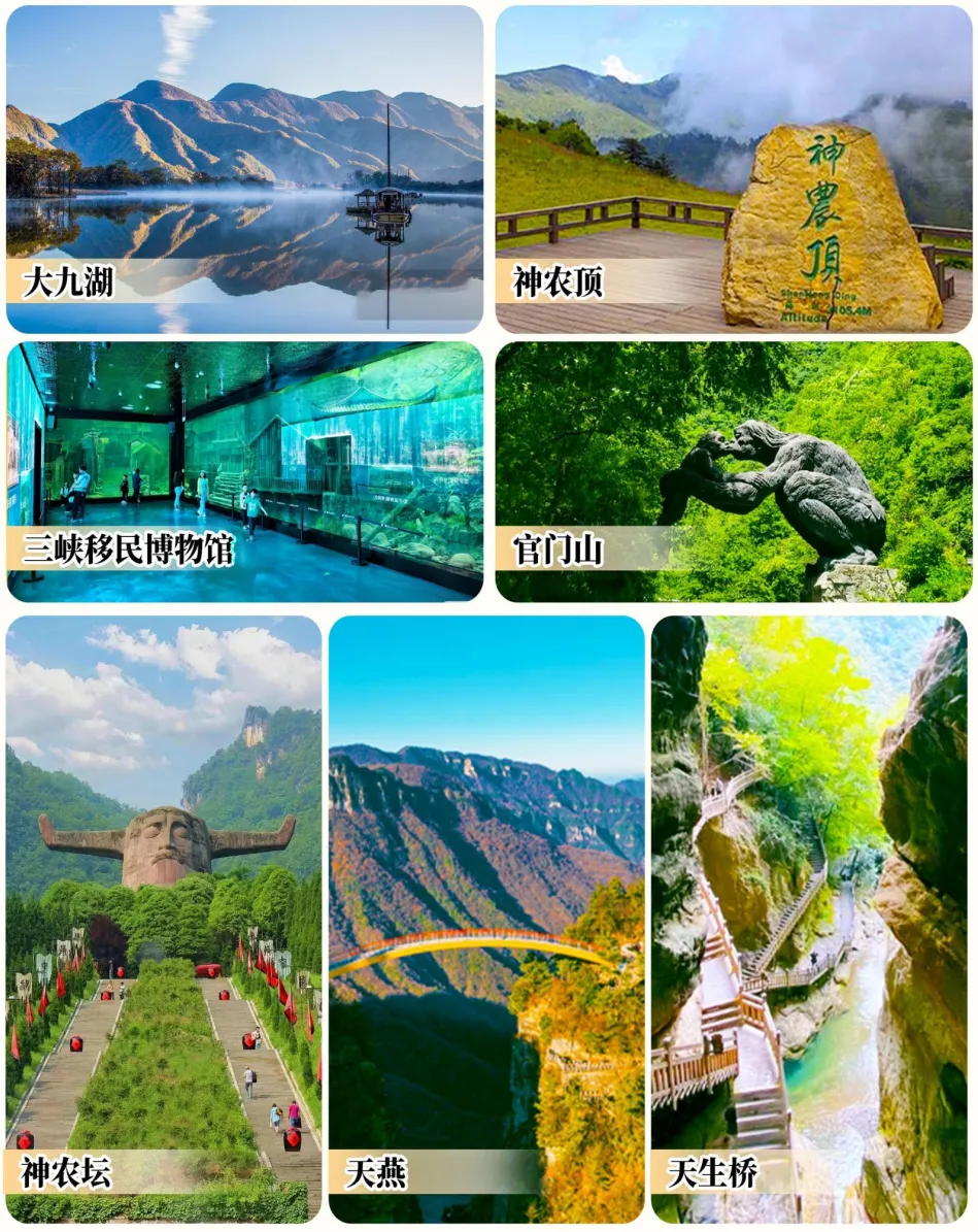 早餐后乘车经 G348 国道前往神农架。沿途欣赏原汁原味的长江三峡风光,包括牛肝马肺峡、兵书宝剑峡、最美水上公路等。这些景点不仅展示了自然美景,还融合了人文历史和地质科普知识,成为徒步和骑行爱好者的天堂。途经秭归县时前往参观【宜昌三峡移民博物馆】(车程约 1 小时,游览时间约 1 小时)是湖北省首座全面展示三峡移民历史的专题博物馆。它通过历史实物、场景复原及独特的水下展厅,生动再现了库区移民长达 30 年的迁徙历程与家国情怀。博物馆不仅铭记了移民“舍小家为大家”的奉献精神,也成为见证三峡工程历史与传承移民文化的重要地标。