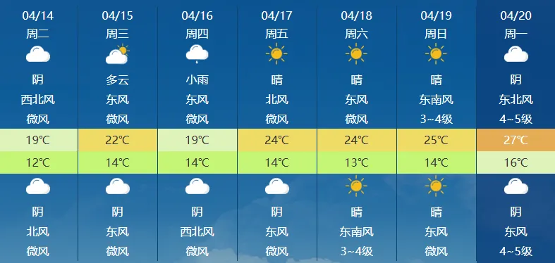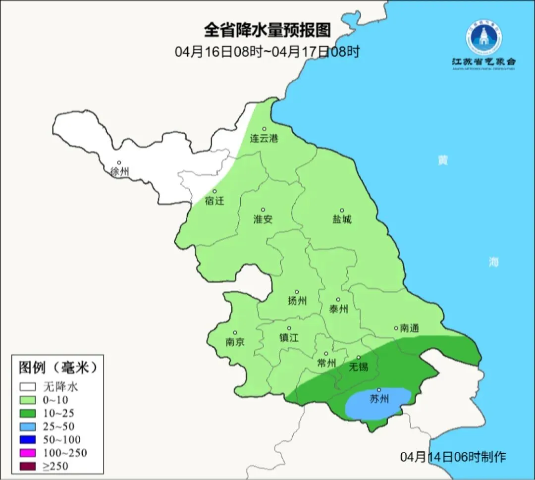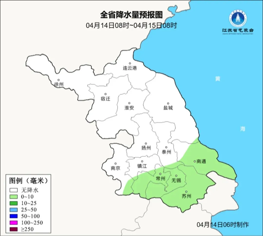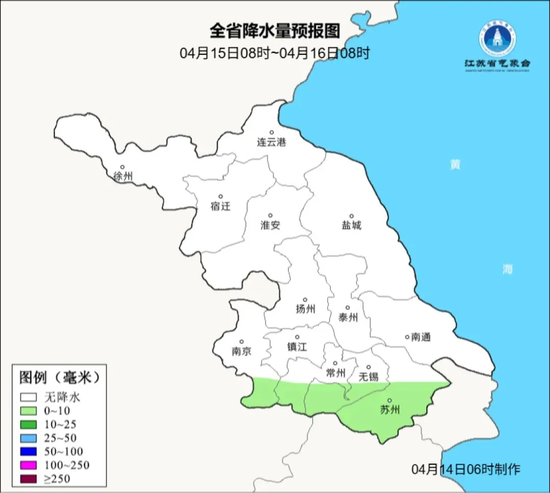 4月14日08时至4月15日08时,沿江和苏南地区阴有阵雨并渐止转阴到多云,其他地区多云。