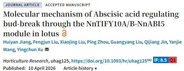 莲顶芽萌发是其开花调控的关键阶段,植物激素在芽发育中起核心作用,但脱落酸(ABA)与茉莉酸(JA)信号互作调控莲顶芽萌发的分子机制仍不清晰。已有研究表明,ABA 参与多年生植物芽休眠维持,关键转录因子ABI5是 ABA 信号核心,可抑制种子萌发与芽萌发;而TIFY/JAZ 蛋白作为 JA 通路抑制因子,能与多种激素信号节点互作,但其与 ABI5 协同调控芽萌发的功能尚未被解析。近日,南京农业大学徐迎春教授团队在园艺学顶刊Horticulture Research上发表题为:Molecular mechanism of Abscisic acid regulating bud-break through the NnTIFY10A/B-NnABI5 module in lotus 的研究型论文。研究以莲(Nelumbo nucifera)为材料,揭示脱落酸(ABA)通过NnTIFY10A/B–NnABI5 模块调控莲顶芽萌发的分子机制:外源 ABA 显著抑制顶芽萌发,关键转录因子NnABI5负向调控萌发并直接激活下游NnEM1/6;茉莉酸(JA)通路抑制蛋白NnTIFY10A/B与 NnABI5 互作、削弱其转录激活能力,正向促进顶芽萌发;ABA 可加速 NnTIFY10A/B 降解,JA 合成抑制剂 DIECA 能缓解 ABA 的抑制效应,最终阐明ABA 与 JA 信号交叉协同调控莲顶芽萌发的核心通路。NnTIFY10A与NnTIFY10B的功能验证