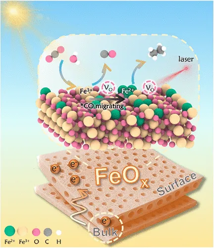 本研究通过构筑无定形 FeOx 介孔纳米片(FeOx-ns) 并进一步采用脉冲激光刻蚀调控氧空位与 Fe²⁺/Fe³⁺ 比例,实现了对 CO₂ 光还原路径的精准调控,使反应选择性从 CO 生成显著转向 C₂H₆ 生成,展现出优异的多碳燃料光催化性能。