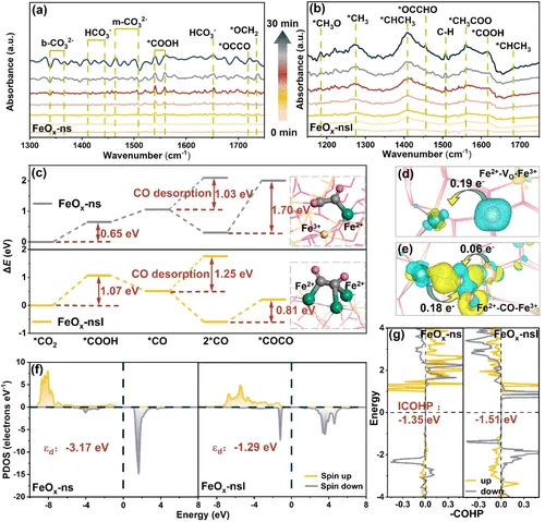 **Fe³⁺ 位点负责 CO₂ 活化与 *CO 生成,而 Fe²⁺ 位点则强吸附 CO 并促进 OCCO 偶联,形成“串联催化机制”.氧空位引起的局域电子结构极化使 *CO 更易从 Fe³⁺ 迁移至 Fe²⁺,并在介孔限域中富集,提高偶联概率。Fe²⁺ 的 d 带中心更接近费米能级,表现出更强的 C–O 键相互作用与更高的催化活性。