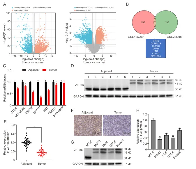 在两个 GEO 数据集中筛选出 7 个差异基因,其中 ZFP36 在骨肉瘤组织中 mRNA 水平下调最显著。Western blot 及 IHC 证实,ZFP36 蛋白在骨肉瘤组织及细胞系中均低表达,条带约 45–50 kD 并存在磷酸化修饰,提示 ZFP36 可能参与骨肉瘤进展。