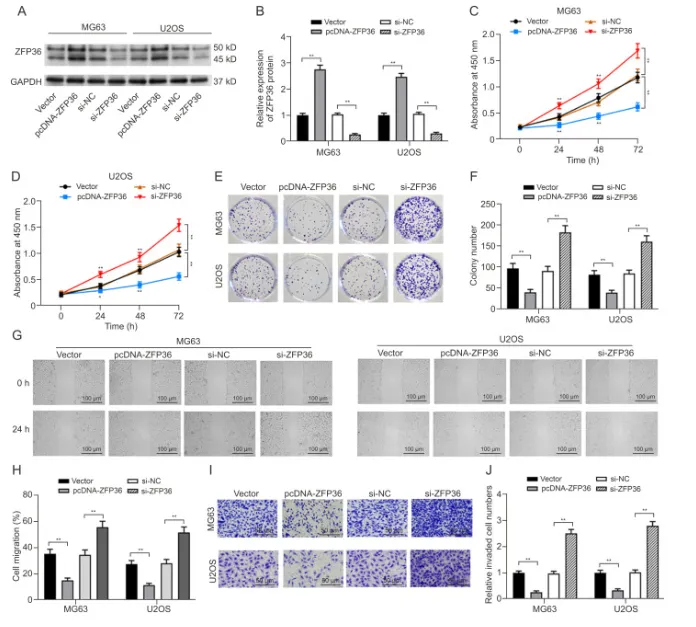 在 MG63 和 U2OS 细胞中验证 ZFP36 功能:过表达 ZFP36 可显著提高其蛋白水平,而 si-ZFP36 则有效敲低 ZFP36 表达。功能实验显示,ZFP36 过表达明显抑制骨肉瘤细胞的增殖、克隆形成、迁移及侵袭能力,敲低则呈现相反效应。