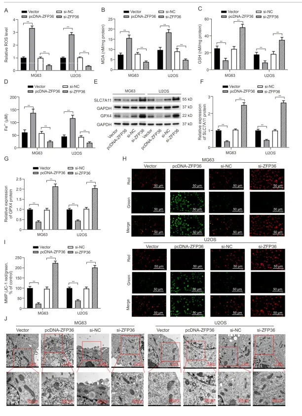 ZFP36 为铁死亡相关基因。过表达 ZFP36 可升高 ROS、MDA 及 Fe²⁺水平,降低 GSH 含量,抑制 GPX4、SLC7A11 表达,并破坏线粒体膜电位、造成线粒体结构损伤;敲低 ZFP36 则作用相反。提示 ZFP36 过表达可促进骨肉瘤细胞铁死亡与线粒体功能障碍。