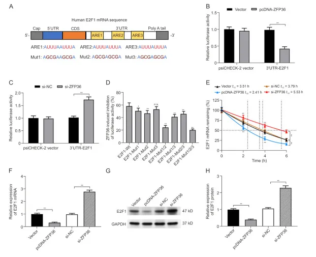 ZFP36 可结合转录本 3ʹUTR 的 AREs 促进 mRNA 降解。E2F1 mRNA 3ʹUTR 含 3 条 ARE 序列,ZFP36 过表达可降低其荧光素酶活性,敲低则相反;突变 ARE1 和 ARE2 可逆转该抑制效应,ARE3 无影响。放线霉素 D 实验显示,ZFP36 过表达缩短 E2F1 mRNA 半衰期、加速其降解,同时抑制 E2F1 mRNA 及蛋白表达,敲低则作用相反。