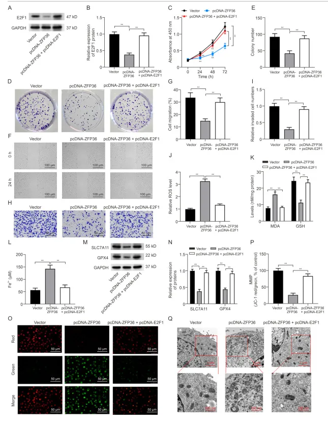 在 MG63 细胞中,ZFP36 过表达可降低 E2F1 蛋白水平,pcDNA-E2F1 转染则可升高 E2F1 表达。功能挽救实验显示,E2F1 过表达可逆转 ZFP36 过表达介导的细胞增殖、克隆形成、迁移和侵袭抑制,以及凋亡促进作用;同时可逆转 ZFP36 过表达引起的 ROS、MDA、Fe²⁺水平升高,GSH 水平下降,GPX4、SLC7A11 表达抑制,以及线粒体膜电位损伤和结构异常。