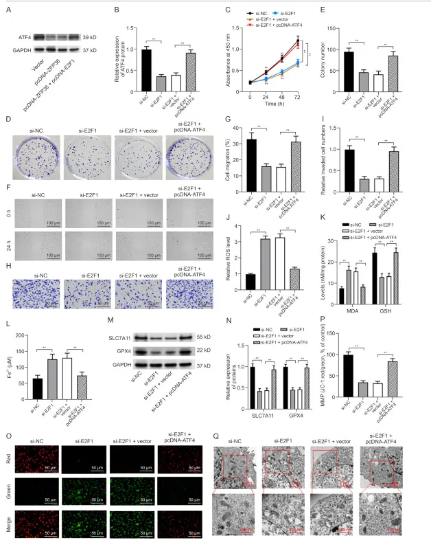 在 MG63 细胞中,敲低 E2F1 可降低 ATF4 表达,而过表达 ATF4 则可逆转这一效应。功能回复实验显示,ATF4 过表达能够抵消 E2F1 敲低所导致的细胞增殖、克隆形成、迁移及侵袭抑制,并可逆转其诱导的 ROS、MDA、Fe²⁺升高、GSH 下降、GPX4/SLC7A11 变化,以及线粒体膜电位损伤与结构异常。