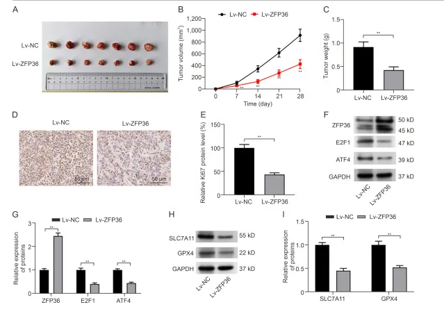 构建骨肉瘤异种移植瘤模型后发现,ZFP36 过表达组肿瘤体积与重量均显著降低。IHC 结果显示,该组 Ki67、E2F1、ATF4、GPX4 及 SLC7A11 蛋白水平均下降,证实 ZFP36 过表达在体内可显著抑制骨肉瘤生长。