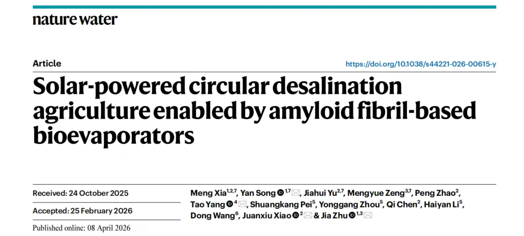 近日,南京大学的研究团队在权威期刊《nature water》(IF=24.1)发表题为“Solar-powered circular desalination agriculture enabled by amyloid fibril-based bioevaporators”的研究性论文。该论文由南京大学能源与资源学院、海南大学海洋技术与装备学院与海南医科大学合作完成,朱嘉教授、宋琰特聘研究员、肖娟秀研究员、杨涛教授为该论文的通讯作者。