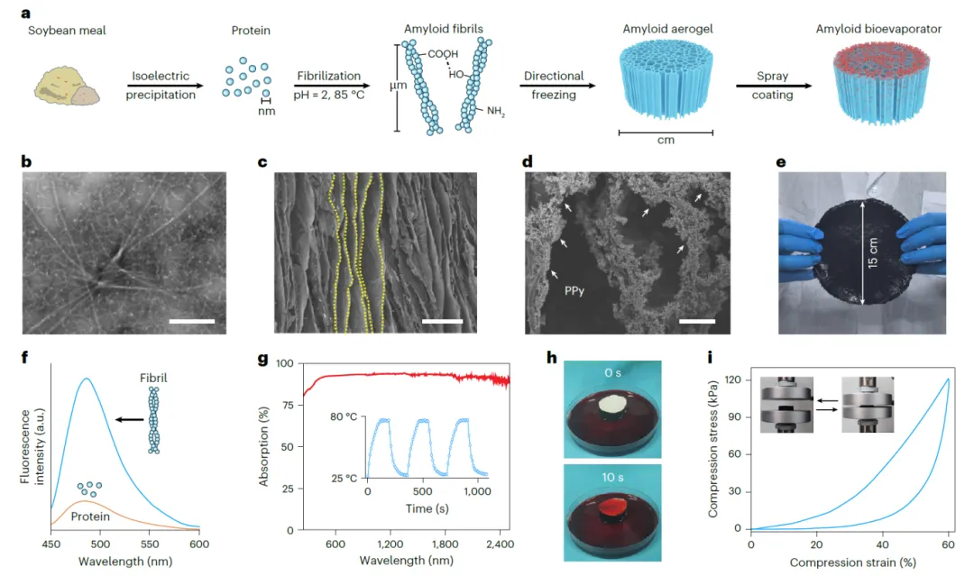图2利用废弃大豆粕进行升级再利用,制备并表征基于淀粉样纤维的生物蒸发器。a,通过自下而上的策略结合分步结构工程,将废弃大豆粕升级为用于界面太阳能脱盐的生物蒸发器。b,大豆淀粉样纤维的透射电子显微镜图像。c,单向淀粉样气凝胶的横截面扫描电子显微镜图像,其垂直排列的通道可增强太阳能脱盐效果。黄色虚线标出了通道。d,基于淀粉样纤维的生物蒸发器的扫描电子显微镜图像,显示PPy功能化成功。箭头指示附着的PPy。e,源自废大豆粕的放大生物蒸发器照片。f,大豆蛋白和淀粉样纤维溶液的硫黄素T荧光光谱。由β-折叠片聚合引起的约490 nm处增强的发射峰证实了淀粉样纤维的形成。g,生物蒸发器在太阳辐射波段(300–2,500 nm)内的吸收光谱。插图:在1倍太阳辐射下,生物蒸发器的表面温度(开启/关闭状态)。h,水(染成红色)在10秒内润湿生物蒸发器,表明其具有优异的润湿性。i,生物蒸发器在高达60%应变下的压缩应力-应变曲线。