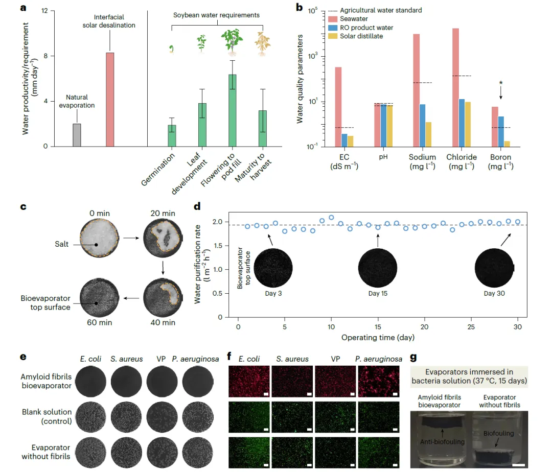 图3基于淀粉样纤维的生物蒸发器在太阳能海水淡化中的性能与稳定性。 a,水资源利用率比较:自然蒸发、脱盐、界面太阳能脱盐与大豆在不同生长阶段的需水量。b,海水、反渗透产水及太阳能蒸馏水与联合国粮食及农业组织农业标准的水质对比。EC,电导率。c,生物蒸发器表面盐分随时间推移的溶解情况,显示60分钟内完全溶解。黄色虚线标记盐分的边界。d,在模拟日周期下的长期太阳能脱盐性能。插图:生物蒸发器顶面在运行3、15和30天后的照片。e,在含淀粉样蛋白的生物蒸发器、空白对照组以及不含淀粉样纤维的传统蒸发器中,2小时后形成的细菌菌落照片。f,与海洋细菌孵育后的活死细菌染色图。活菌呈绿色荧光,受损细胞则呈红色荧光。比例尺,50 μm。g,在含细菌的海水中运行15天后的生物污损测试。淀粉样蛋白生物蒸发器未发生污损,而传统蒸发器则出现了生物污损。图e–g展示了基于淀粉样蛋白纤维的生物蒸发器的抗菌特性。