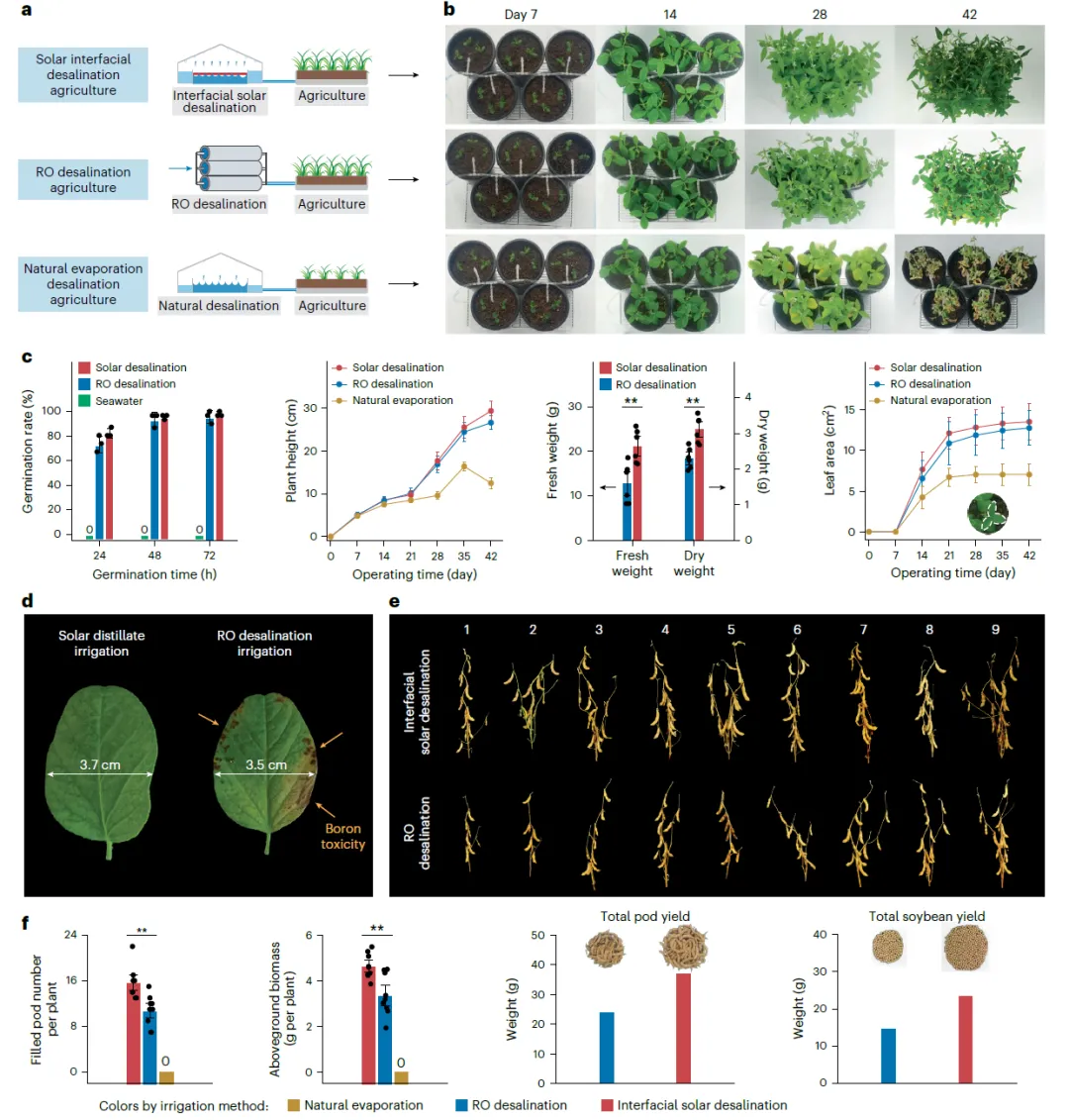 图4 太阳能海水淡化农业的田间试验。a,比较了三种海水淡化灌溉策略:(1) 界面太阳能淡化,(2) 自然蒸发淡化(即不使用光热蒸发器)以及 (3) 反渗透淡化。b,三种灌溉策略下大豆植株的形态发育情况。c,不同灌溉策略下大豆的生长表现,包括发芽率、随时间变化的植株高度、第42天的鲜重以及随时间变化的叶面积。d,第42天的大豆代表性叶片。使用太阳能蒸馏水灌溉的叶片未见明显损伤,而使用RO水灌溉的叶片则因硼毒性导致叶缘发黄。e,使用太阳能蒸馏水和RO水灌溉的成熟大豆植株形态。数字1–9代表各灌溉组中的单株样本。f,不同灌溉策略下的大豆产量,包括每株平均饱满荚数、平均地上部生物量、荚总重及大豆总重。与反渗透水相比,太阳能蒸馏水灌溉的植株产量更高。