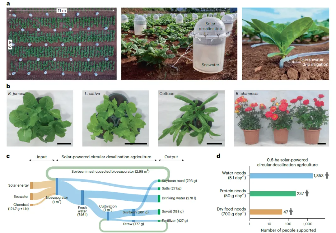 为了验证这一方法,在中国海南岛建造了一个循环式太阳能海水淡化农业系统,并进行了为期3个月的实地测试。我们开展了涵盖发芽、种植、收获、加工及废物升级再利用的全流程实地测试。0.6公顷的种植面积(相当于全球人均平均农业用地)可为1,853人提供饮用水,为237人提供蛋白质,并为47人提供干粮。除大豆外,该方法还成功改良了盐渍化土壤,同时支持了多样化的粮食作物及高价值经济作物(如中国玫瑰),凸显了其广泛的适用性和经济潜力。