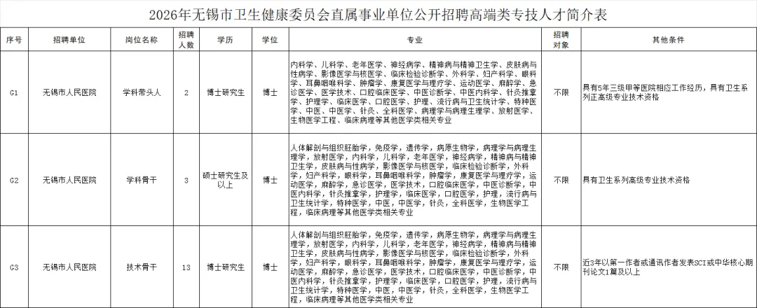 招聘岗位:详见《2026年无锡市卫生健康委员会直属事业单位公开招聘高端类专技人才简介表》(附件1),可在无锡市人力资源和社会保障局、无锡市卫生健康委员会网站查询。