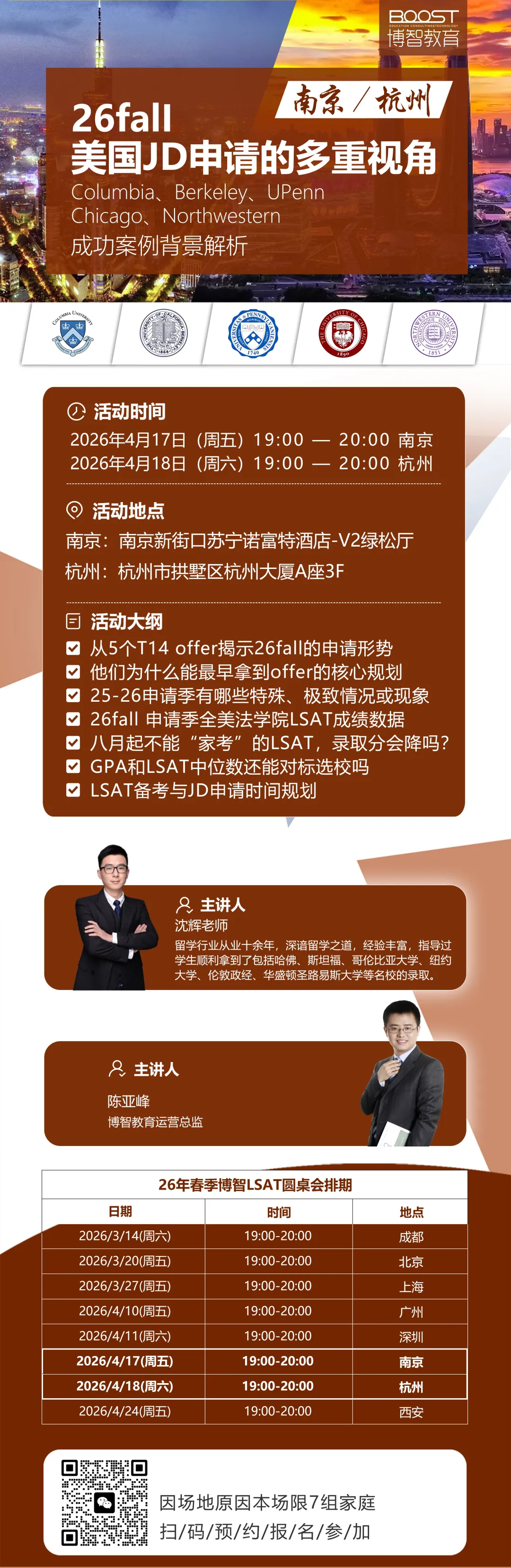 博智教育特别策划「LSAT 与 JD 申请圆桌会全国巡讲」,届时陈亚峰老师和沈辉老师会深度解析博智T14申请成功案例,为你拆解申请逻辑,规划备考路径,让你在 27fall 申请季中抢占先机。