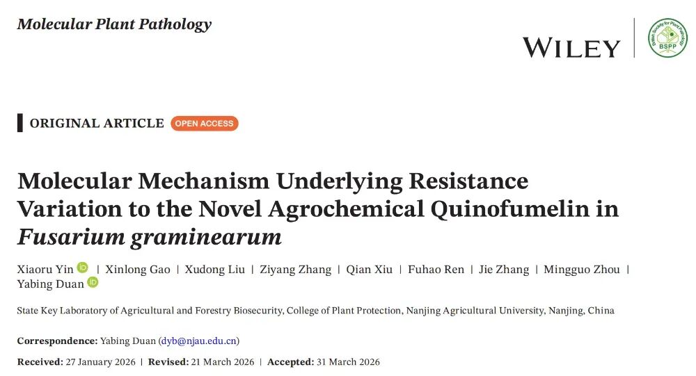 南京农业大学揭示了禾谷镰孢菌对新型杀菌剂quinofumelin的抗药性变异分子机制,为小麦赤霉病绿色防控添新策
