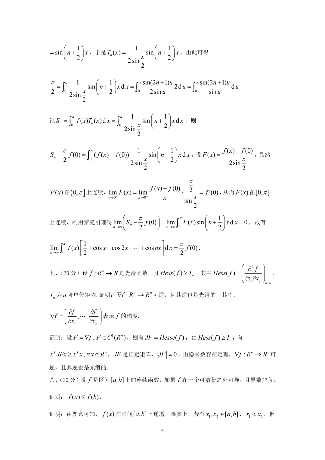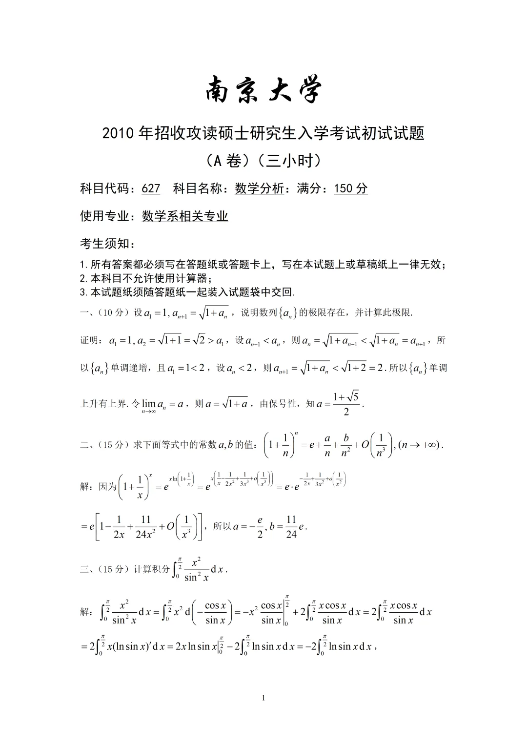 南京大学2010年招收攻读硕士学位研究生入学考试《数学分析》试题及答案,第一题选择题我给出了详细的解答,有助于同学们对每一个概念有一个准确的认识,不但知其然,而且知其所以然,对一致连续性,无穷大量、函数的改变量、级数的收敛与绝对收敛。第二题填空题,给出了为什么填这个值的理由,写出了详细的推导过程,第三题证明题等等,总的来说,我们对每个题目都做了详尽的解答,以便让同学们一看就明白,容易掌握这个知识点,对复习考研是很有好处的,以后我会对北京交通大学的题目逐一给出解答,对这个学校有报考意向的同学,可以下载参考,希望对同学们有所帮助,做真题前,好好复习课本是很有必要的,课本要反复的看,题要反复的做,日积月累,终会有所收获的,数学的学习很辛苦,同学们只要坚持去学,不会多问,一定能够达到目的.