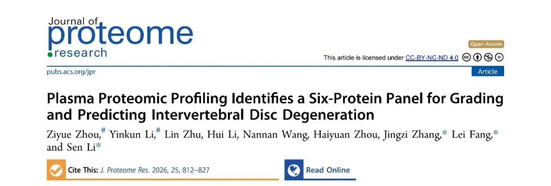 2026年南京大学医学院方雷团队和南京鼓楼医院李森团队发表名为“Plasma Proteomic Profiling Identifies a Six-Protein Panel for Grading and Predicting Intervertebral Disc Degeneration”文章,通过病例对照研究,用 SomaScan 技术对比 Ⅱ、Ⅴ 级 IDD 患者血浆,筛选出 COL6α3 等 6 个差异显著蛋白;经 50 例患者酶联免疫吸附试验(ELISA )验证后构建六蛋白组合模型,AUC 达 0.8700,为 IDD 早期诊断提供了无创、快速的血浆生物标志物,由云准实验室提供SomaScan检测服务。