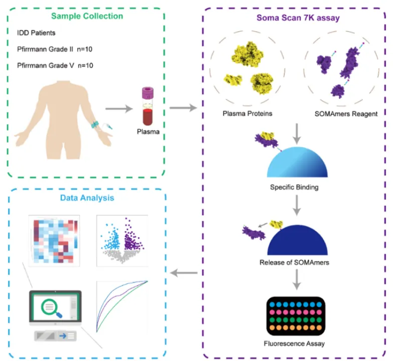 椎间盘退变(IDD)是全球范围内高发的慢性骨骼肌肉疾病,可引发顽固性腰背痛、肢体功能障碍等问题,累及各年龄阶层且在中老年群体中尤为突出,严重降低患者生活质量,也给全球医疗体系带来沉重负担。目前 IDD 的病理机制尚未被完全阐明,临床评估病情依赖医师主观判读,存在操作难度大、评价结果不客观的问题,且缺乏能实现早期诊断、动态监测的无创手段。血浆因成分稳定、易采集,是理想的无创生物标志物来源,已在多种肿瘤的早诊和预后评估中广泛应用,而 SomaScan 适配体技术的发展,为 IDD 血浆蛋白标志物的筛选提供了技术支撑。