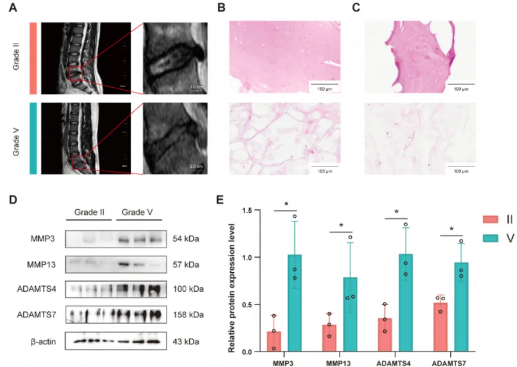 本研究依据 Pfirrmann 分级系统,对不同退变程度的IDD患者的血浆临床特征进行了分析,本研究纳入的 Ⅱ 级退变病例均符合髓核部分纤维化但椎间盘高度维持正常的标准,而 Ⅴ 级退变病例则严格符合髓核信号丢失伴随椎间隙塌陷的终末期特征(图 2A)。MMP3、MMP13、ADAMTS4 和 ADAMTS7 的活性升高会通过分解胶原和聚集蛋白聚糖,破坏椎间盘结构与功能,进而促进椎间盘退变进展,这些标志物也可作为该疾病的潜在生物标志物。作者得到了 MMP3、MMP13、MMP3、MMP13、ADAMTS4 和 ADAMTS7 的蛋白印迹结果(图 2D),并以 β- 肌动蛋白的相对蛋白表达量为参照完成了定量分析(图 2E),这进一步验证了本研究中样本分级的可靠性。