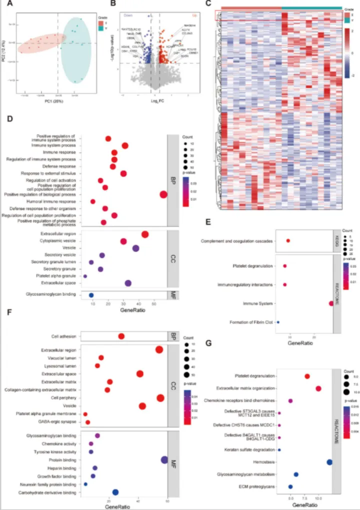 本研究借助高通量 SomaScan 蛋白质组学技术平台,对 20 例IDD患者的血浆样本开展了全面的蛋白质组学分析,其中包含 10 例 Ⅱ 级退变患者和 10 例 Ⅴ 级退变患者。通过主成分分析(PCA)对血浆蛋白质组学数据进行整体评估,结果显示样本的组内重复性良好,组间差异则具有统计学显著性(图 3A)。研究筛选出 208 种在样本中呈现出统计学显著且一致性差异表达的蛋白,107 种蛋白显著上调、101 种蛋白显著下调,呈现出明确的表达差异模式,同时绘制火山图和热图将该表达差异可视化,并重点标注出了一组上调最为显著的蛋白(图 3B、C)。在GO和KEGG的通路注释分析中发现,发现这些差异蛋白显著富集于与人类免疫系统及细胞外基质(ECM)组装相关的通路。在GO功能注释分析中,上调蛋白主要富集于细胞外基质免疫调控及免疫应答激活相关通路(图 3D)。这一研究结果在GO、REACTOME 通路分析中也得到进一步验证,结果显示这些蛋白在补体激活和固有免疫应答相关通路中显著富集,包括补体与凝血级联反应通路(hsa04610),这表明椎间盘退变晚期与免疫微环境的活跃改变密切相关(图 3E)。与此同时作者开展了 REACTOME 通路富集分析(图 3G),明确了此类蛋白在相关生物通路中的富集特点。