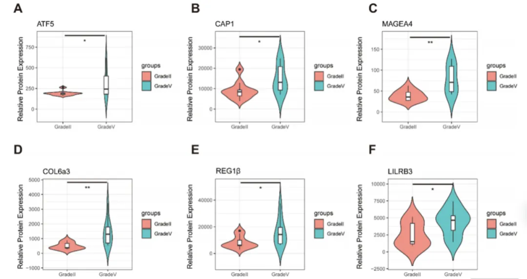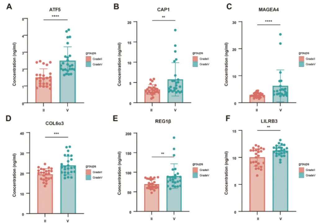 随后作者在更大规模的血浆样本队列中通过ELISA对这些蛋白进行了验证,该队列共包含 50 例患者的样本。验证结果证实,这六种蛋白在上述两个退变分级组间呈现出稳定且显著的表达差异,柱状图展示了这六种蛋白的表达差异情况,分别为 ATF5(图 5A)、CAP1(图 5B)、MAGEA4(图 5C)、COL6α3(图 5D)、REG1β(图 5E)和 LILRB3(图 5F)。具体而言,应激调控因子ATF5在 Ⅴ 级组中的表达水平(2.495 ± 0.8256 ng/mL)较 Ⅱ 级组(1.502 ± 0.5074 ng/mL)显著升高,差异具有高度统计学意义。细胞骨架调控蛋白CAP1的表达量也由 Ⅱ 级组的 3.236 ± 1.229 ng/mL 升高至 Ⅴ 级组的 5.754 ± 4.114 ng/mL。最为显著的是,ECM核心成分COL6α3在 Ⅴ 级组中的浓度(23.73 ± 4.591 ng/mL)显著高于 Ⅱ 级组(19.40 ± 2.800 ng/mL)。免疫调控分子LILRB3由 Ⅱ 级组的 10.00 ± 1.621 ng/mL 升高至 Ⅴ 级组的 11.25 ± 0.8256 ng/mL,呈显著上升趋势;而肿瘤相关抗原MAGEA4同样表现出大幅升高,由 Ⅱ 级组的 2.825 ± 0.7773 ng/mL 上升至 Ⅴ 级组的 6.236 ± 5.889 ng/mL。此外,组织修复相关蛋白 REG1β 在 Ⅴ 级退变组中的浓度(90.06 ± 31.34 ng/mL)较 Ⅱ 级退变组(69.59 ± 12.01 ng/mL)显著升高。这些结果通过 ELISA 实验验证了本研究前期蛋白质组学结果的可靠性,同时揭示了上述分子在IDD进程中的动态变化,这为构建基于外周血生物标志物的退变分级诊断体系提供了实验依据。值得注意的是,MAGEA4表现出最大的表达倍数变化(2.2 倍),COL6α3稳定的差异表达特征凸显了其作为临床诊断标志物的潜力。